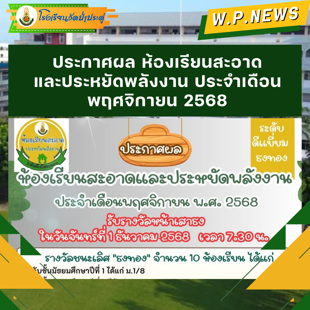 ประกาศผล ห้องเรียนสะอาดและประหยัดพลังงาน พฤศจิกายน 2568